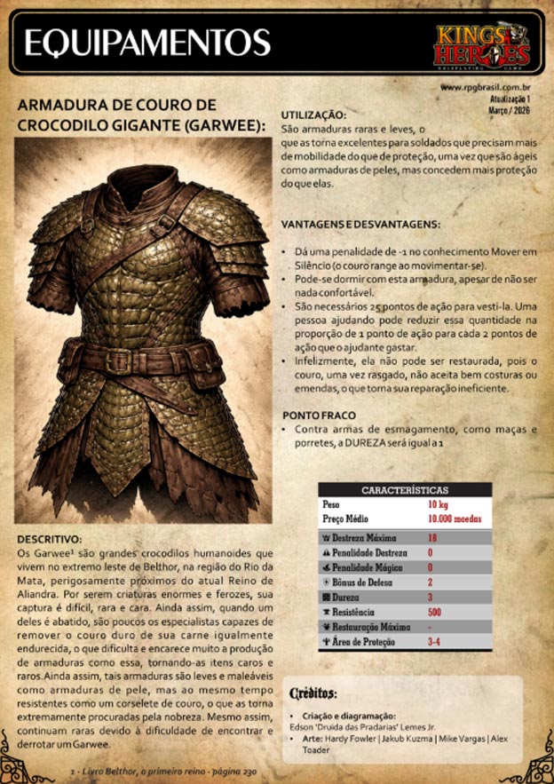 Suplemento com novas armas, armaduras, regras especiais, para incrementar ainda mais sua mesa de Kings & Heroes.
