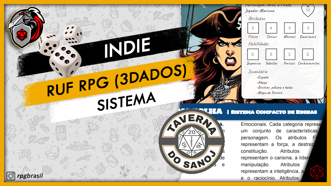 RUF RPG (RPG de Uma Folha) é um sistema de RPG leve, ágil e focado na narrativa, ideal para adaptar histórias de filmes, animes e videogames com simplicidade e dinamismo. Com uma mecânica central baseada em rolagens de 3D10, ele oferece testes que equilibram Atributos e Habilidades de maneira clara e intuitiva.